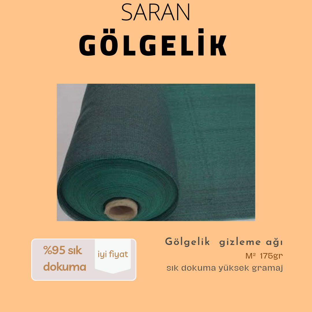 +Güneşi %95 engelleyip, %5 geçirmektedir. +metrekare ağırlığı 175gr dır !!!!(kalın kaliteli sağlamdır.) + ürünümüzün kenarlarında 4 cm genişliğinde kolon bulunmaktadır. +ürünümüzün 4 kenarı50 cm arayla kapsül kuş gözü çakılmış olarak gönderilmektedir. +%95 sıklıkta olup görüntüyü, tozu ve rüzgarı %95 oranında keser. %5 deliklidir. +Ürünlerimiz UV katkılıdır. +Özel hammadde bileşimi ve dokuma özelliği ile dayanıklı olup, uzun yıllar kullanılabilir, ekonomiktir. +Eşit gölgeleme ve güneşin zararlı ışınlarından koruma sağlar. +Kullanılan alanlarda, yapılan sulamanın buharlaşmasını azaltır. +Gölgeleme yapılan alanı çiğ, kırağı, toz gibi çevresel etmenlerden korur. +Tarım ve hayvancılık sektöründe verimliliği arttırır. +Seralar, fidanlıklar, hayvancılık işletmeleri ve barınakları, peyzaj alanları, tarlalar, çiçek üretim tesisleri, çit kenarlarına, havuz kenarlarına, otopark üstünü kapatmak için ve daha birçok alanda kullanılmaktadır. +Kuş ve zararlı böceklere karşı korur. Dekoratif ve şık bir görüntü oluşturur. +Görüntü kesme filesi olarak kullanılır. + rüzgarda zarar görmez +Hava sirkülasyonu sağlar. +Uzun ömürlüdür. +